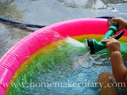 Then, when the little one becomes restless and can’t stand the heat during daytime , I become the lifeguard and set up the mini pool for him to soak in..