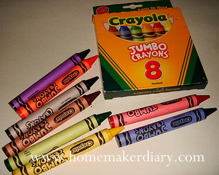 We finally bought the Jumbo Crayon at Tango Mango, The Curve. However the Jumbo packs are only available in 8 colors. It is called jumbo since the size is 5″ long × 9/16″ diameter (127 mm × 14 mm). The key primary and secondary colors, in the pack include Blue, Purple, Brown, Red, Orange, Black, Green and Yellow.