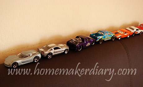 We have exposed our son to a lot of other toys – bike, train, kitchen set, hand puppet, books, art and craft, stuff toys. The only thing we will not buy for him is a Barbie. He plays with all those toys mentioned above but nothing caught his eye like a car toy…the sparkle in his eyes that is worth more than RM6.90 per hot wheels. As I am writing this now, he is asleep with 2 of those cars. I think boys are just wired that way..heh!
